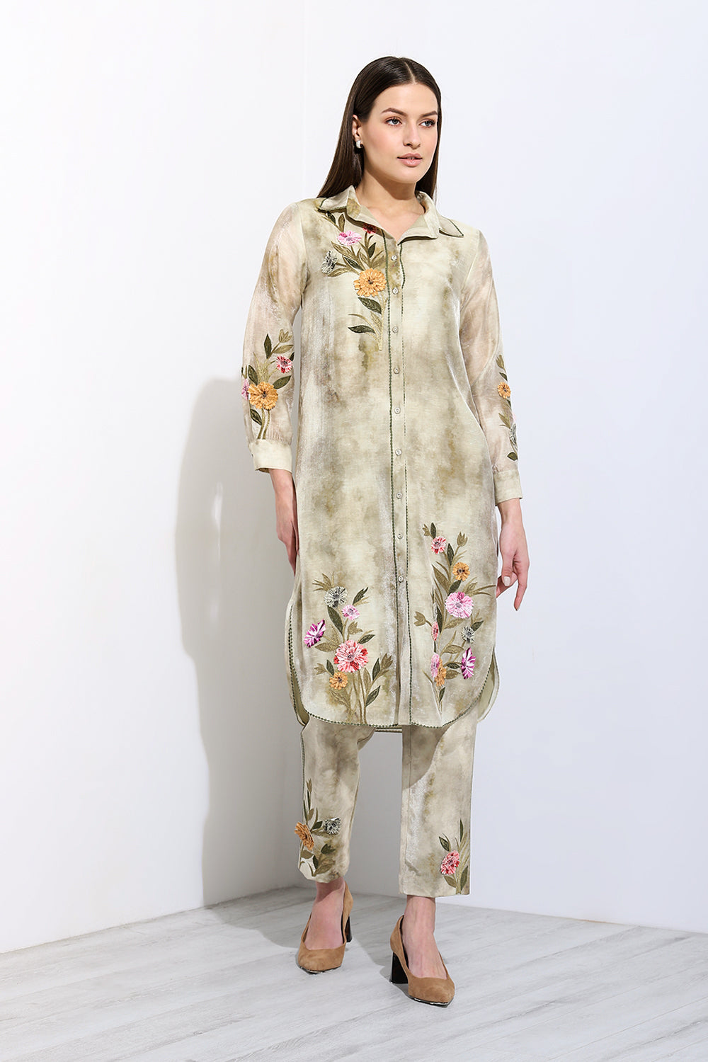 Indulge in the grace of the Alcina Tunic Set, boasting a refined button-down shirt collar and graceful bishop sleeves, epitomizing modern sophistication with a touch of classic charm.