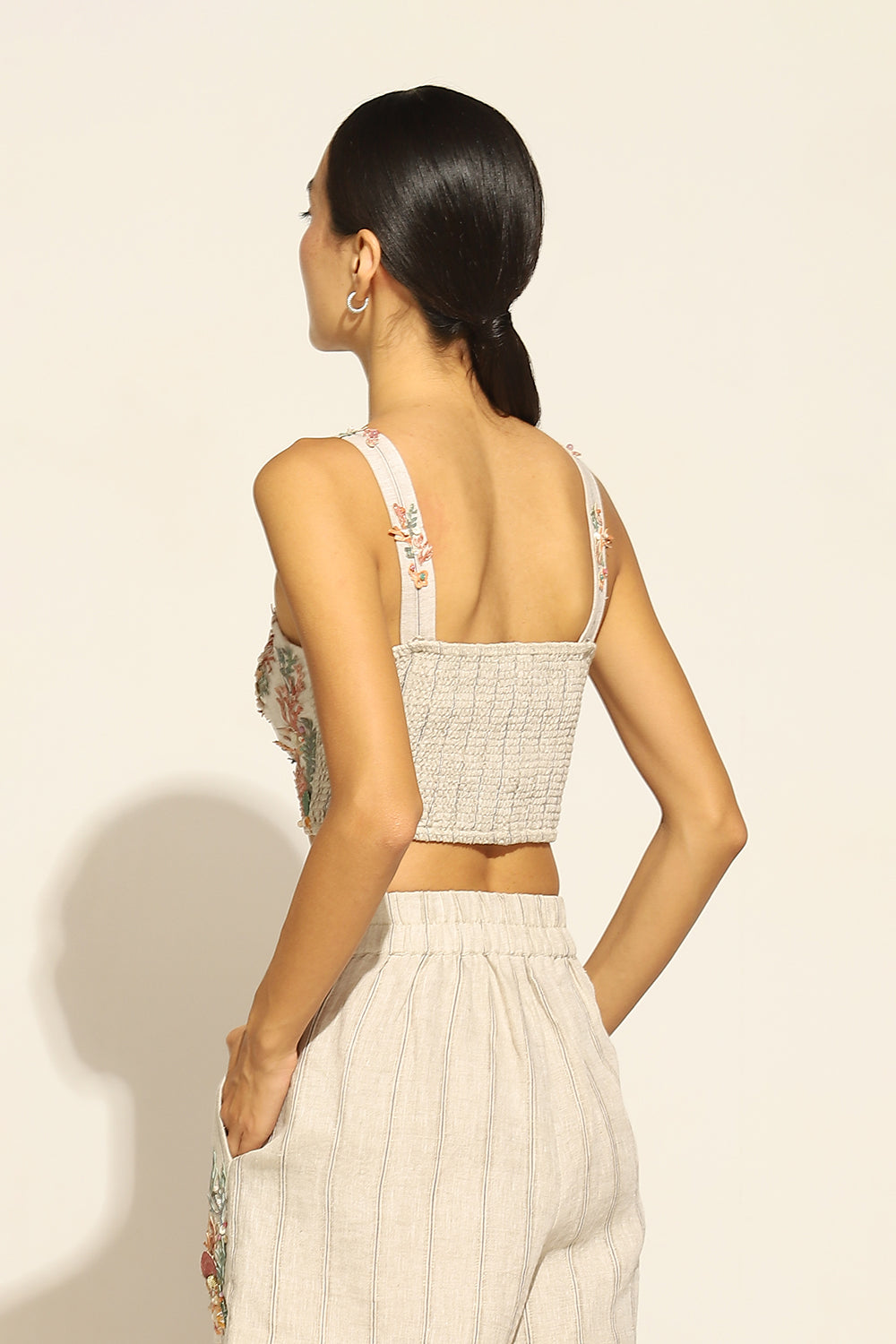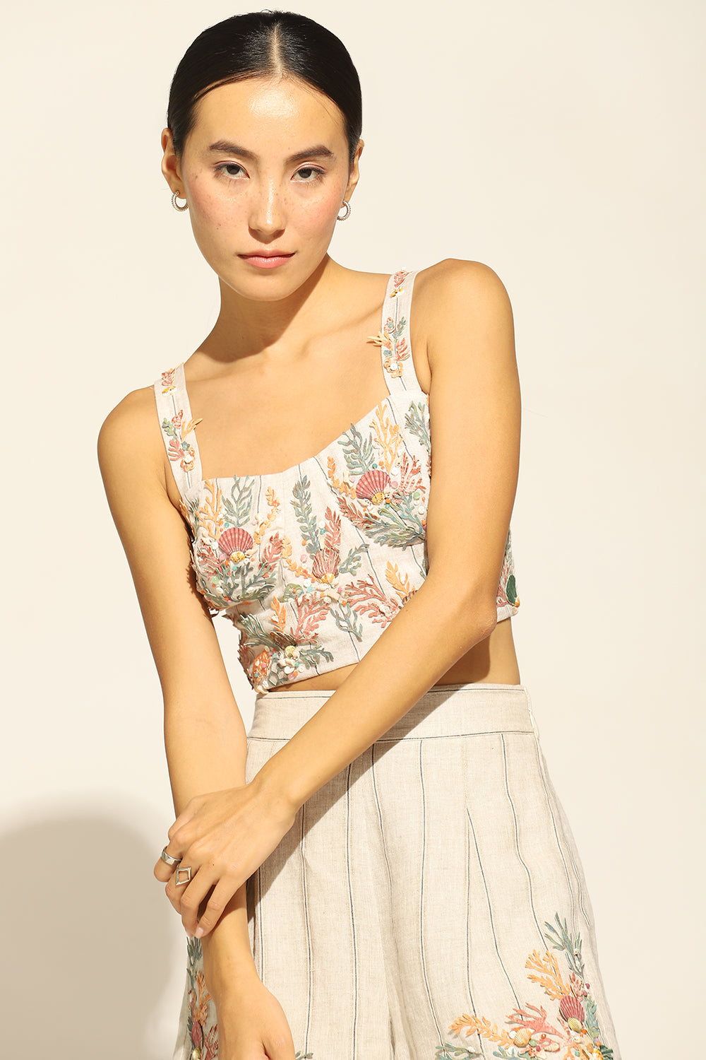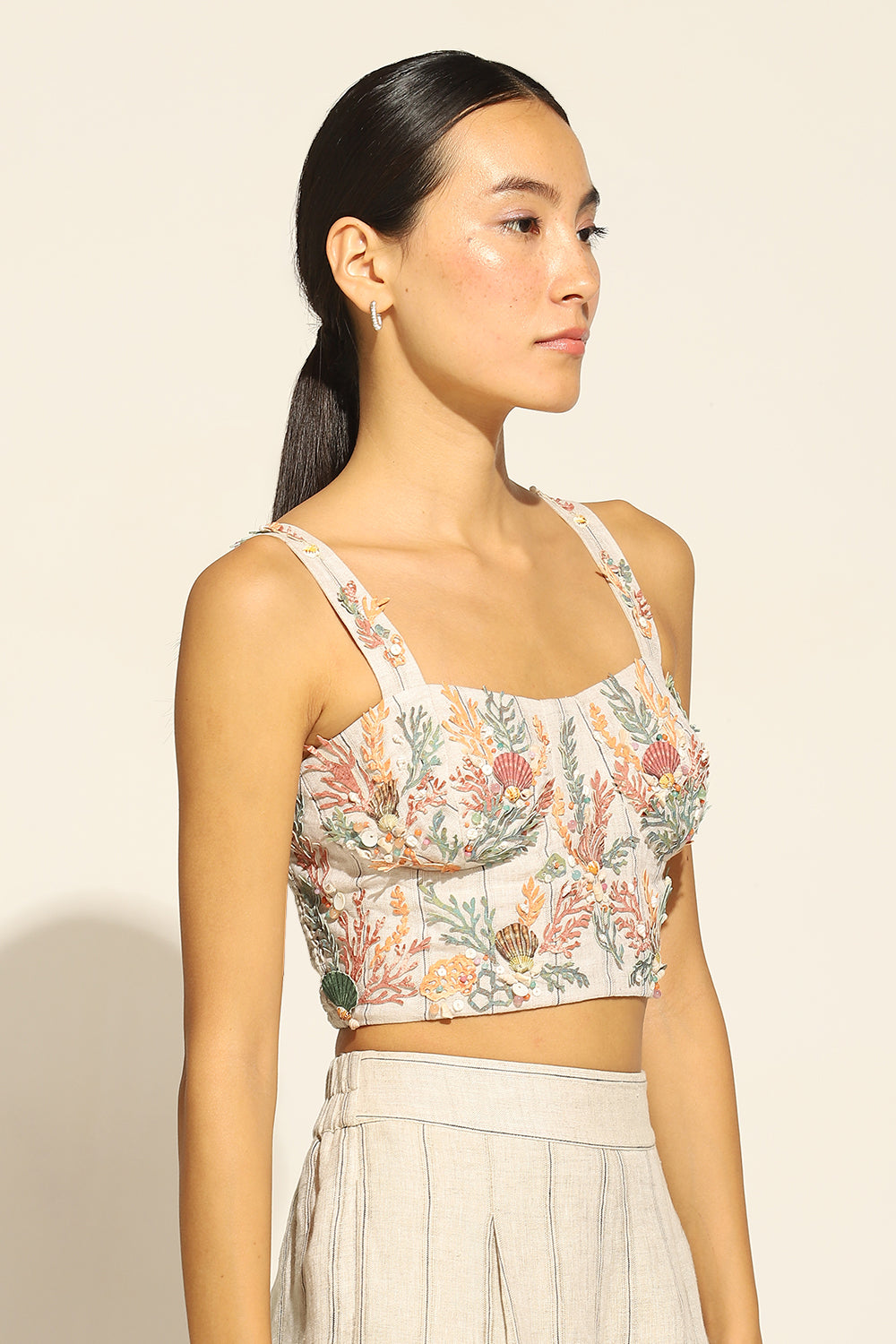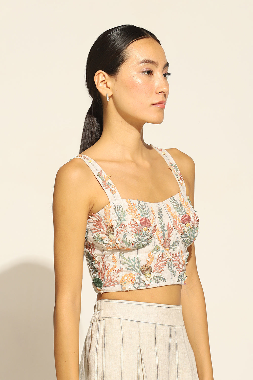 Unveiling the Alisa Corset, adorned with Ranna Gill's iconic Coral Reef embroidery, radiating elegance and allure, ideal for adding a touch of sophistication to your wardrobe.