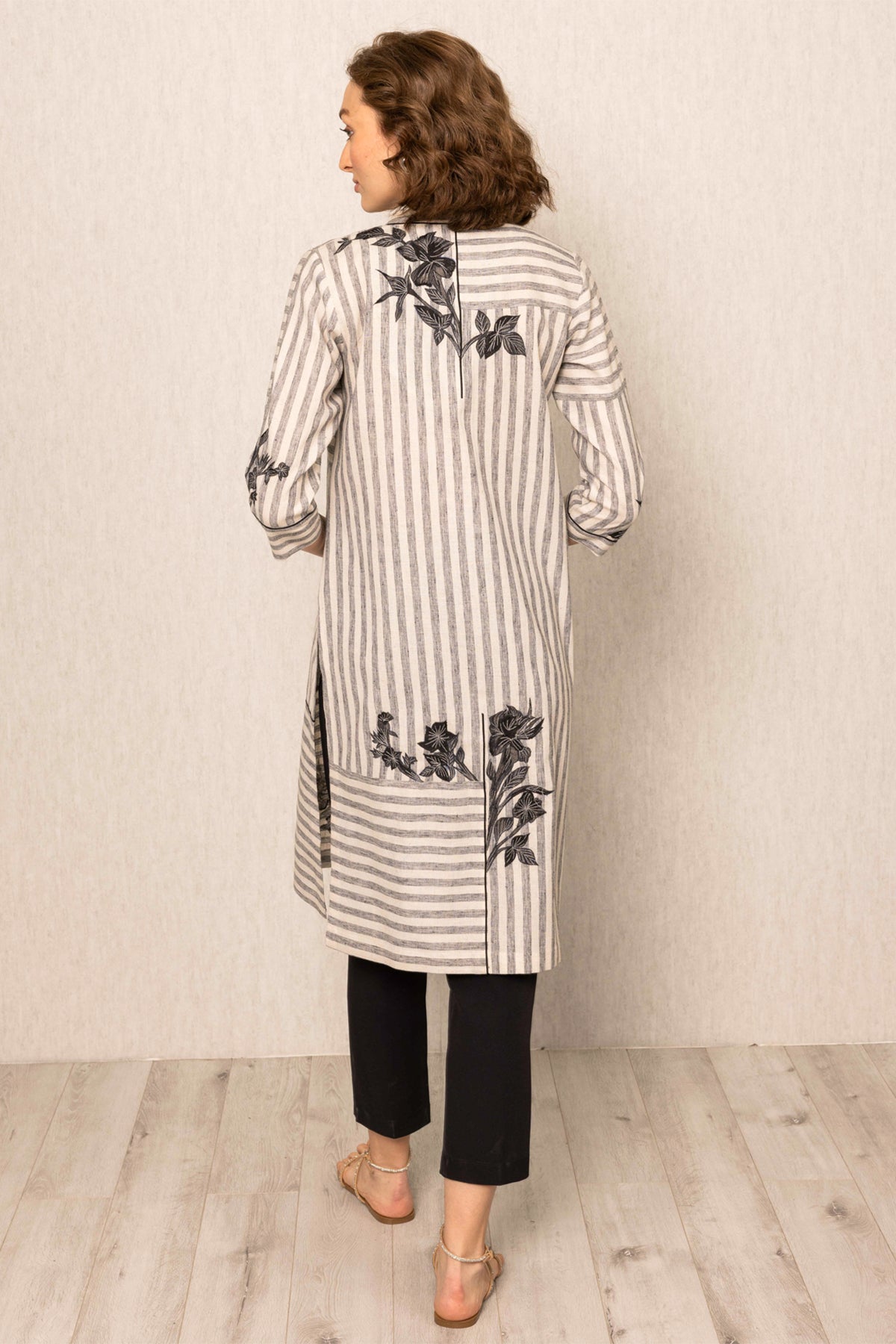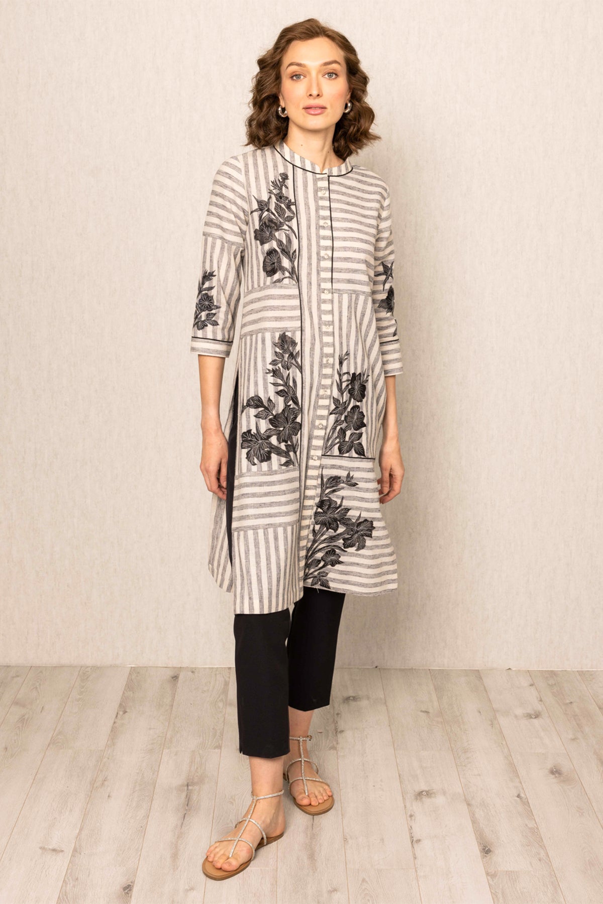 Introducing Ranna Gill's Asteria Tunic, Crafted in breathable Linen Stripe it features a straight silhouette with a classic round neckline and three-quarter sleeves. The paneling of vertical and horizontal stripes creates a striking visual contrast, while delicate floral embroidery in black threadwork adds depth and texture. A front button-down placket enhances its versatile appeal, and subtle pleat details offer ease of movement. Perfect for both casual and semi-formal styling, this tunic pairs beautiful with tailored pants or denim.