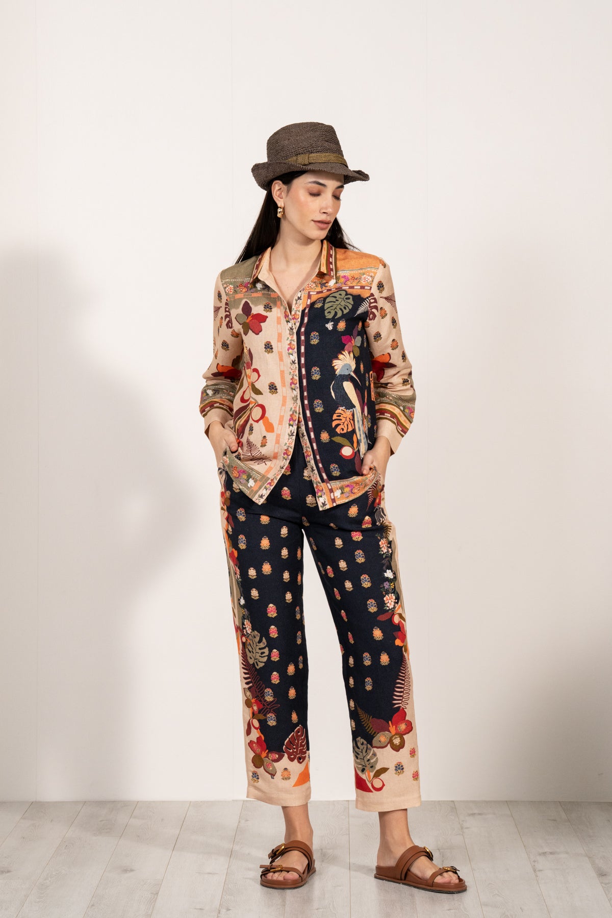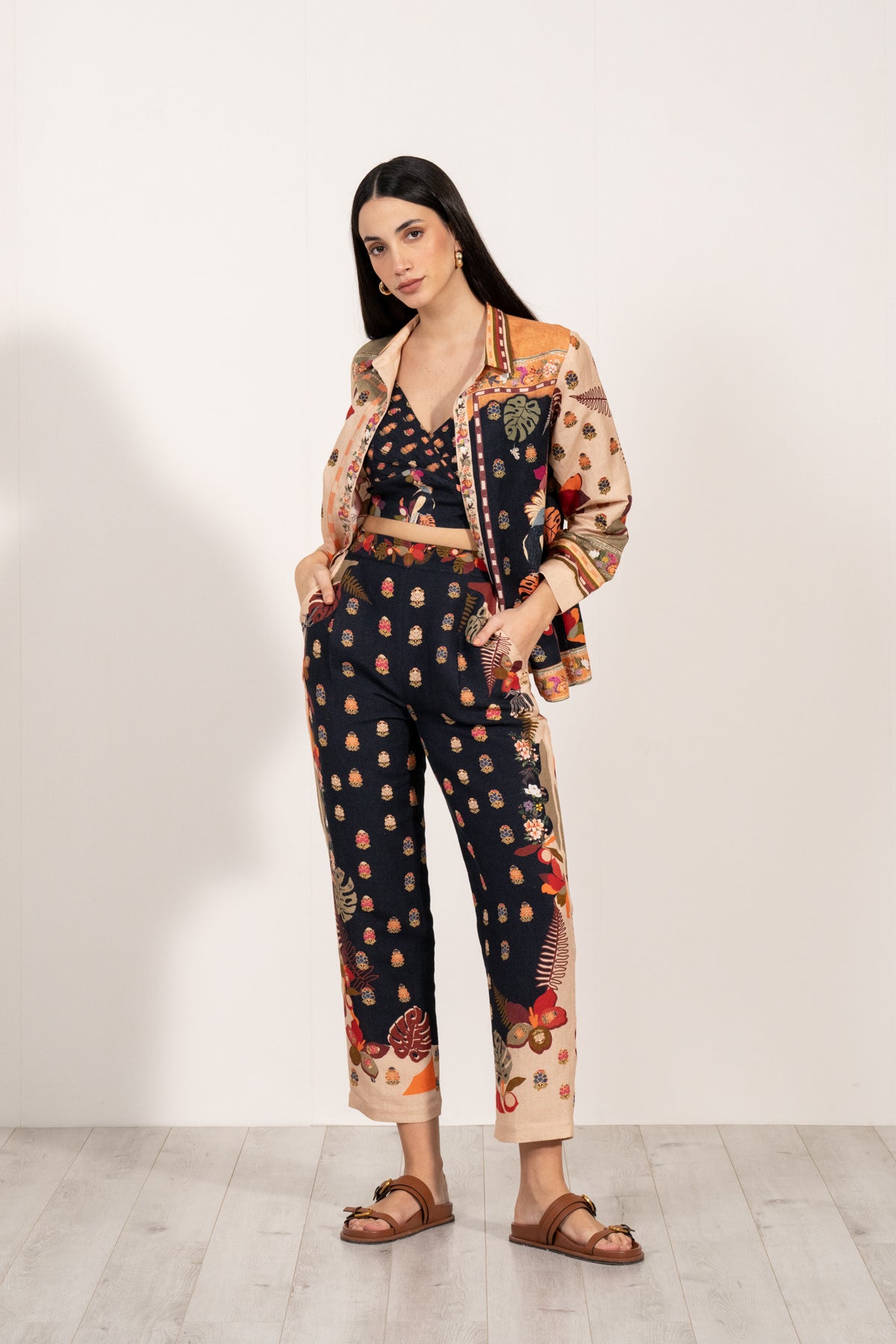 Elevate your wardrobe with Ranna Gill's Astrid Button-Down Shirt, a perfect blend of comfort and style. Made from a luxurious Linen Viscose fabric, this shirt is lightweight, breathable, and ideal for your comfort. Featuring the captivating Puerto Rico print in a striking palette of black and apricot, the design is inspired by tropical landscapes, with lush foliage, vibrant florals, and intricate botanical motifs adding a touch of exotic charm.