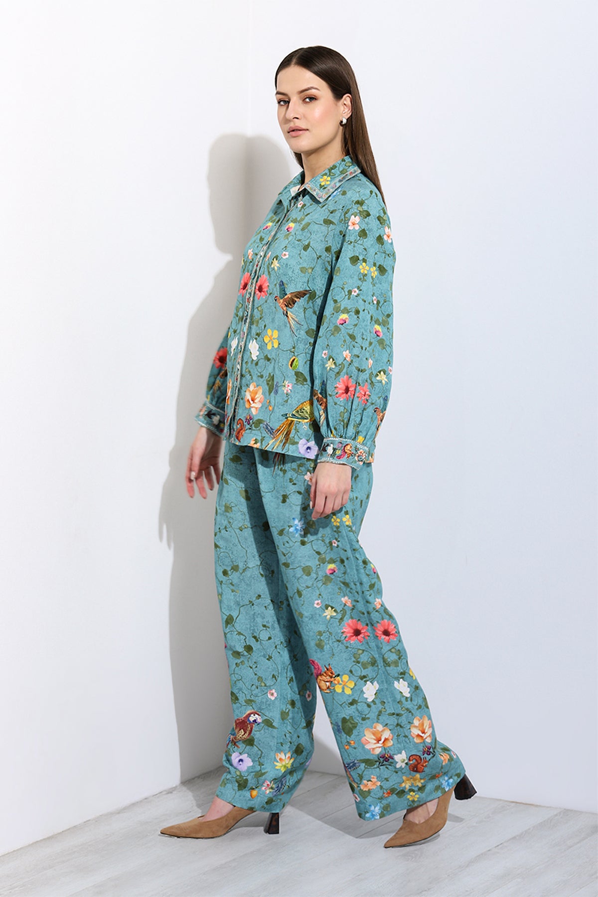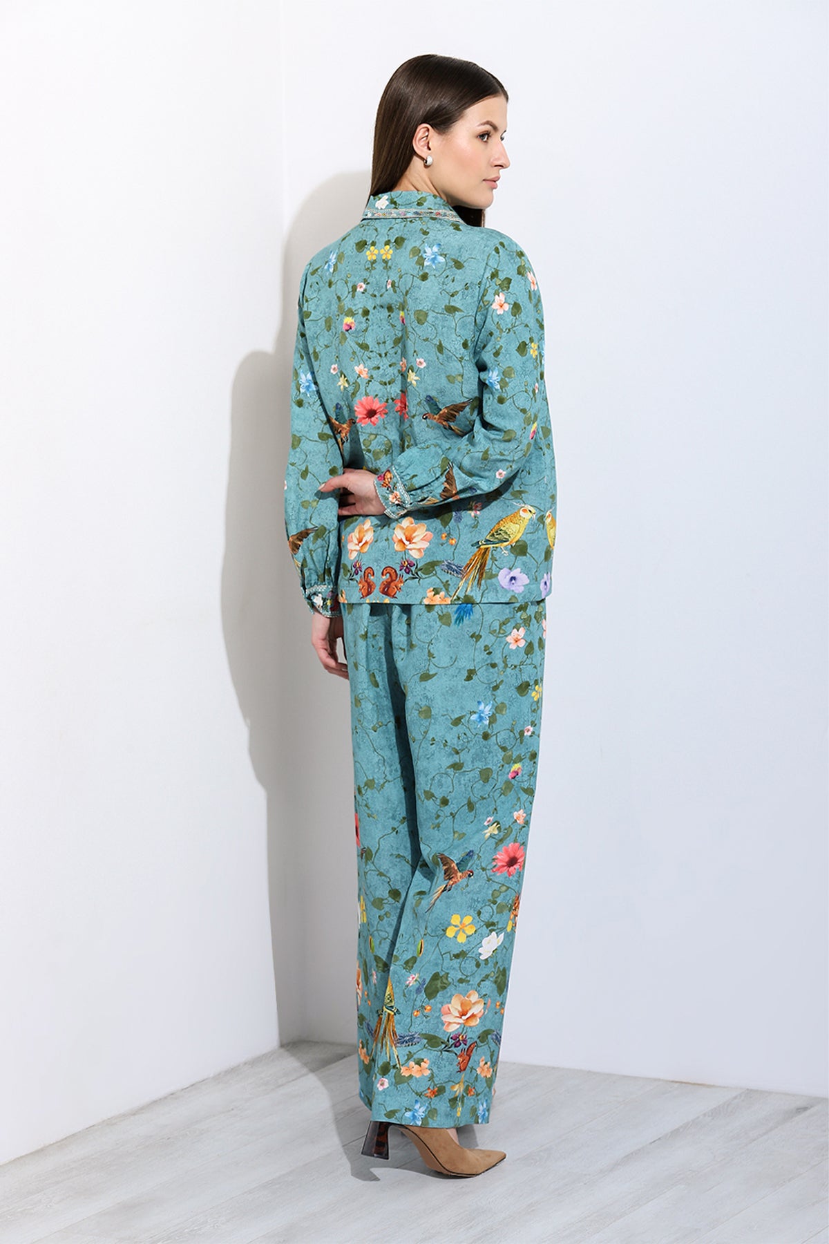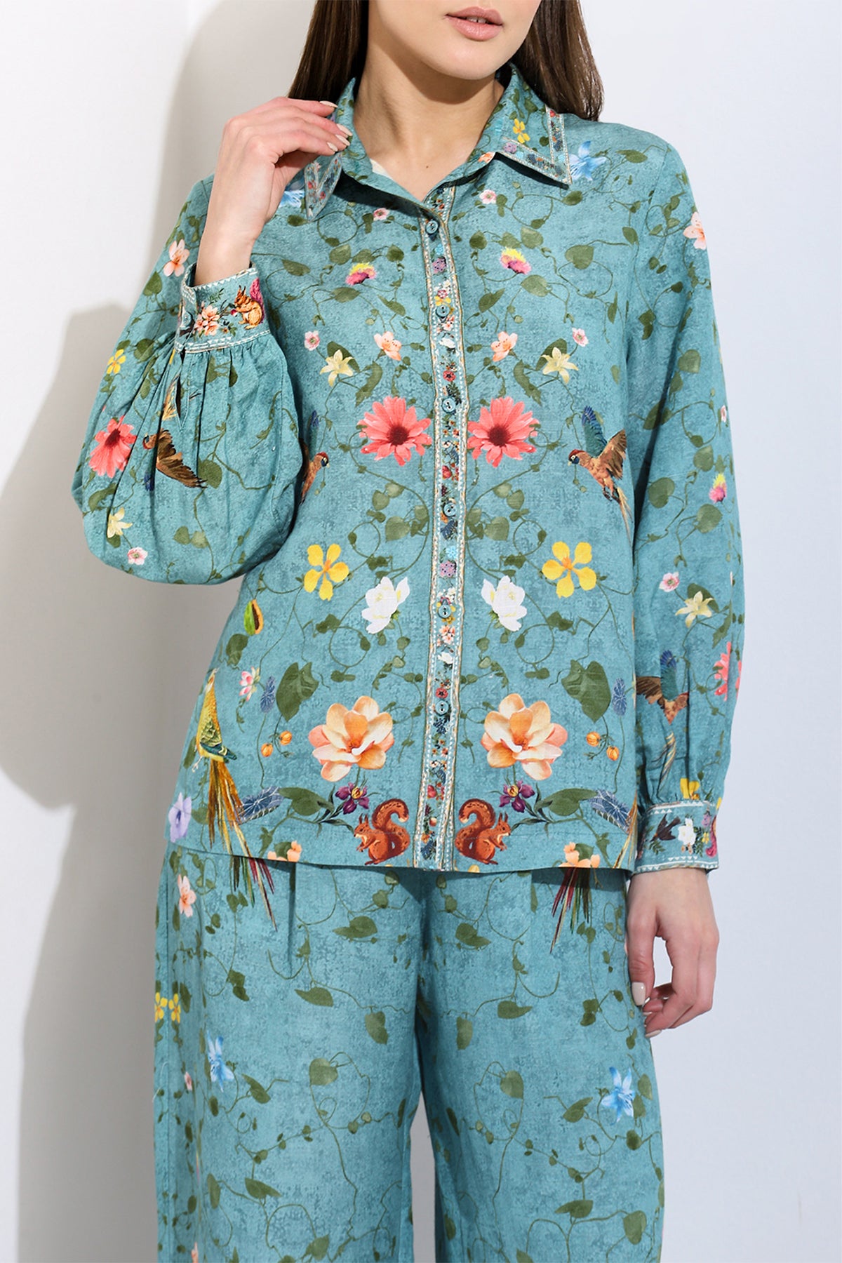 Transform your wardrobe with the ERIKA BUTTONDOWN SHIRT, highlighting Ranna Gill's Signature Jade Montana Print. Created from a lavish linen blend, this shirt showcases enchanting floral and bird patterns, enhanced by its long sleeves and flattering silhouette. Effortlessly pair it with coordinating pants for a polished ensemble that exudes timeless elegance.