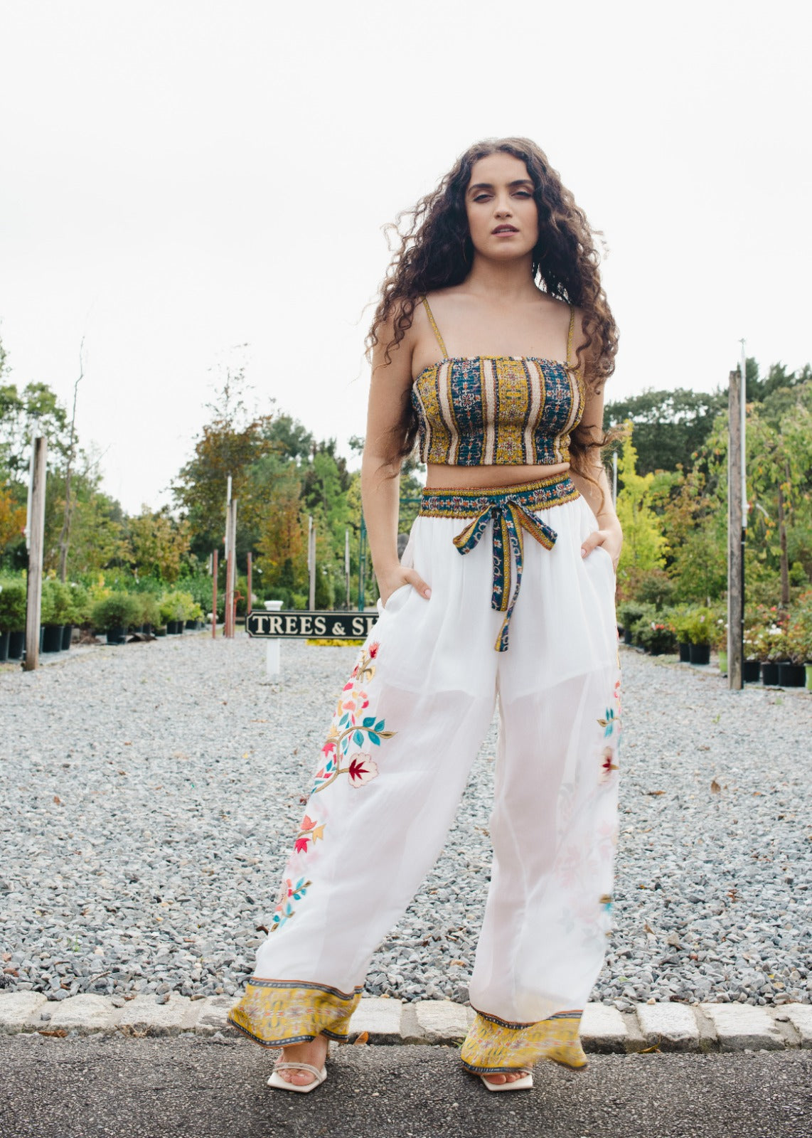 Bustier made from stripes, shown with palazzo is styled in our signature print borders and colourful embroidery.This winner combination makes a bright and cheery look. Good for all-day fashionable wear.