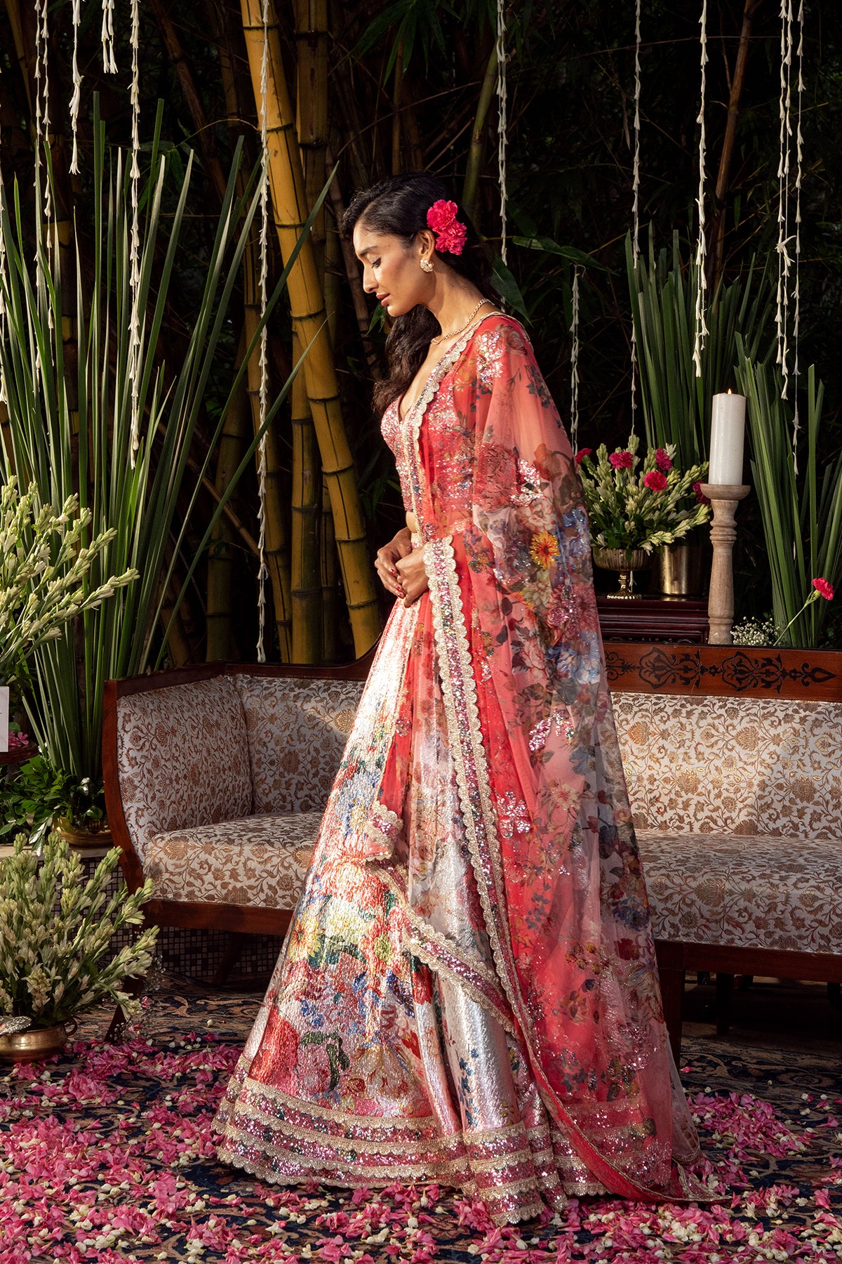 Elevate your festive wardrobe with Ranna Gill's Rosella Sequin Bustier and Floral Lehenga Set. The intricately sequin-embellished bustier adds a touch of sparkle, perfectly complemented by the vibrant floral motifs on the flowing lehenga. The lightweight dupatta, adorned with delicate embroidery and sequins, completes the look, making this ensemble a stunning choice for weddings and festive celebrations.
