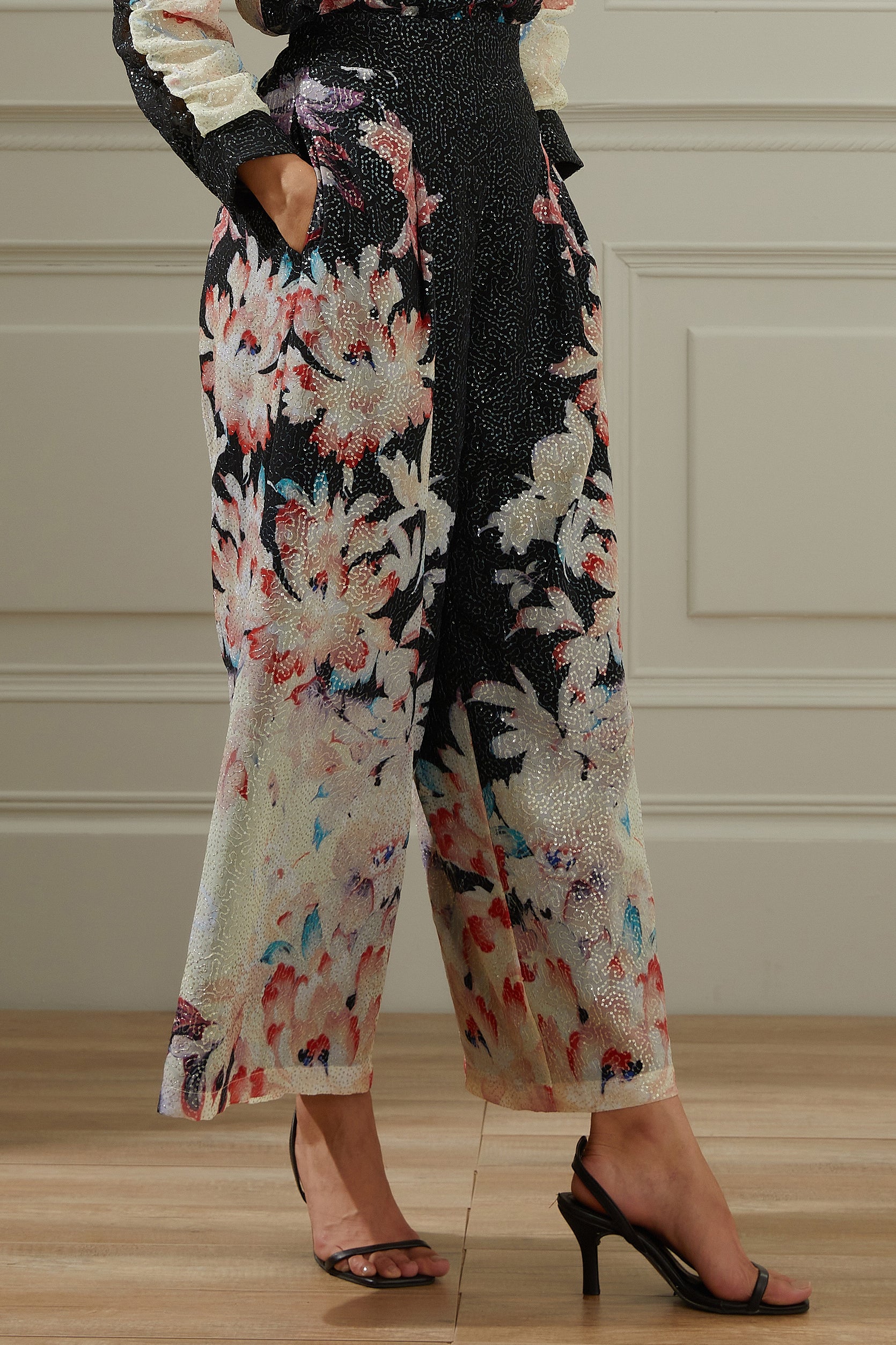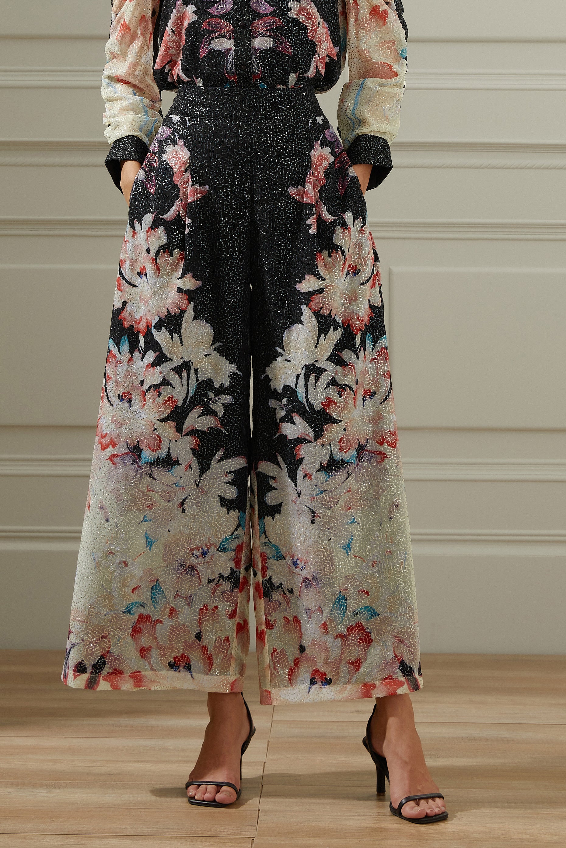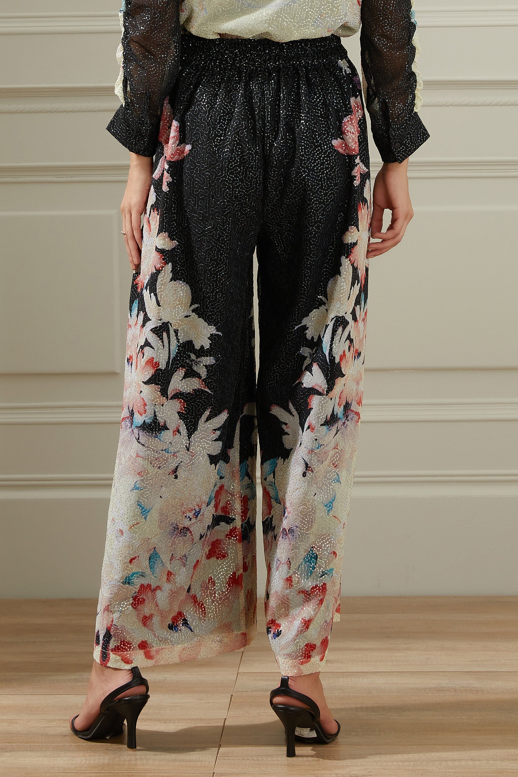 Made in exquisite gold sequins and georgette, this wide-leg pants is elevated with an opulent signature print of Mightnight Floral. Pair it with matching blouse to create a chic co-ordinated look.