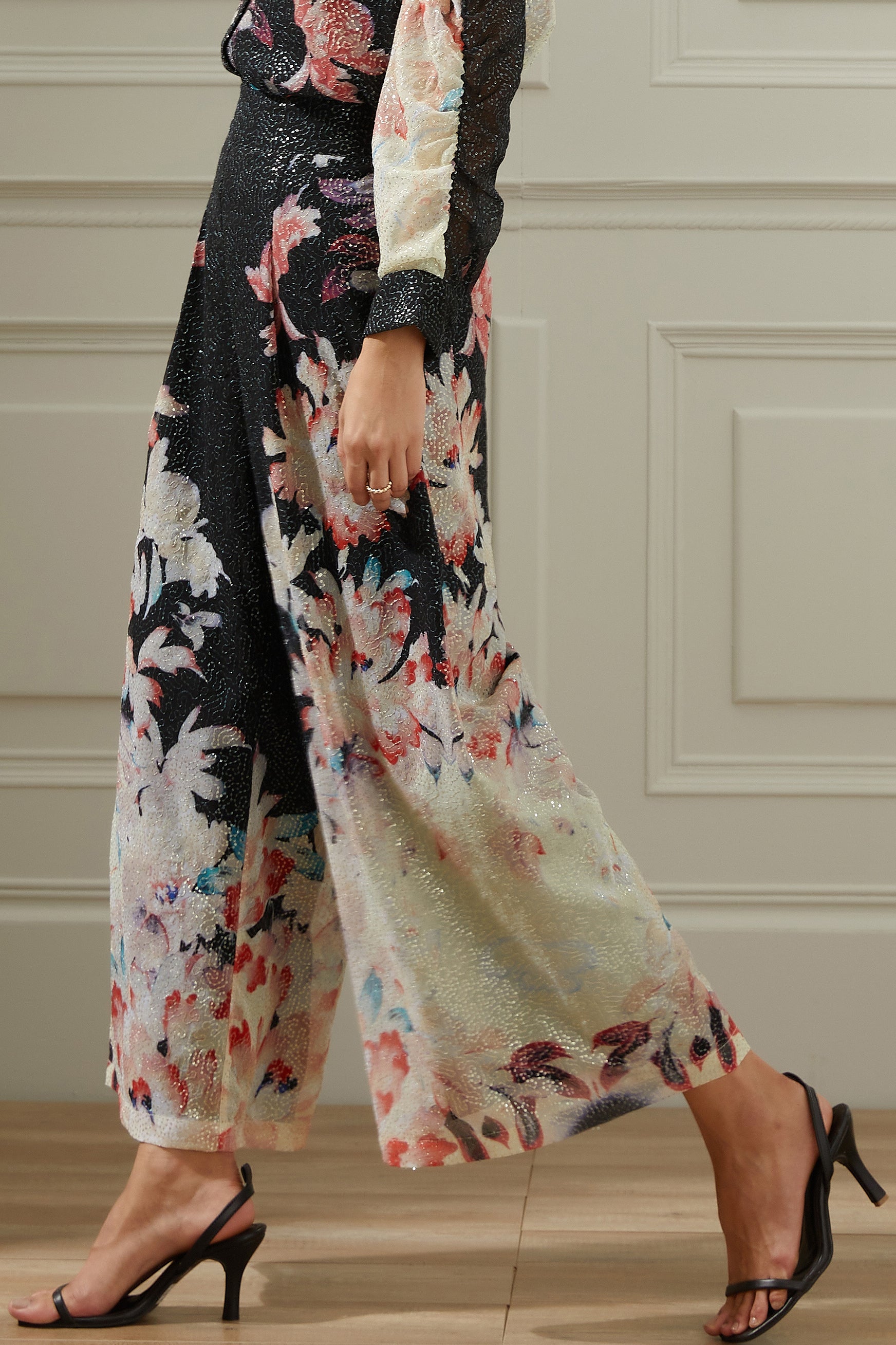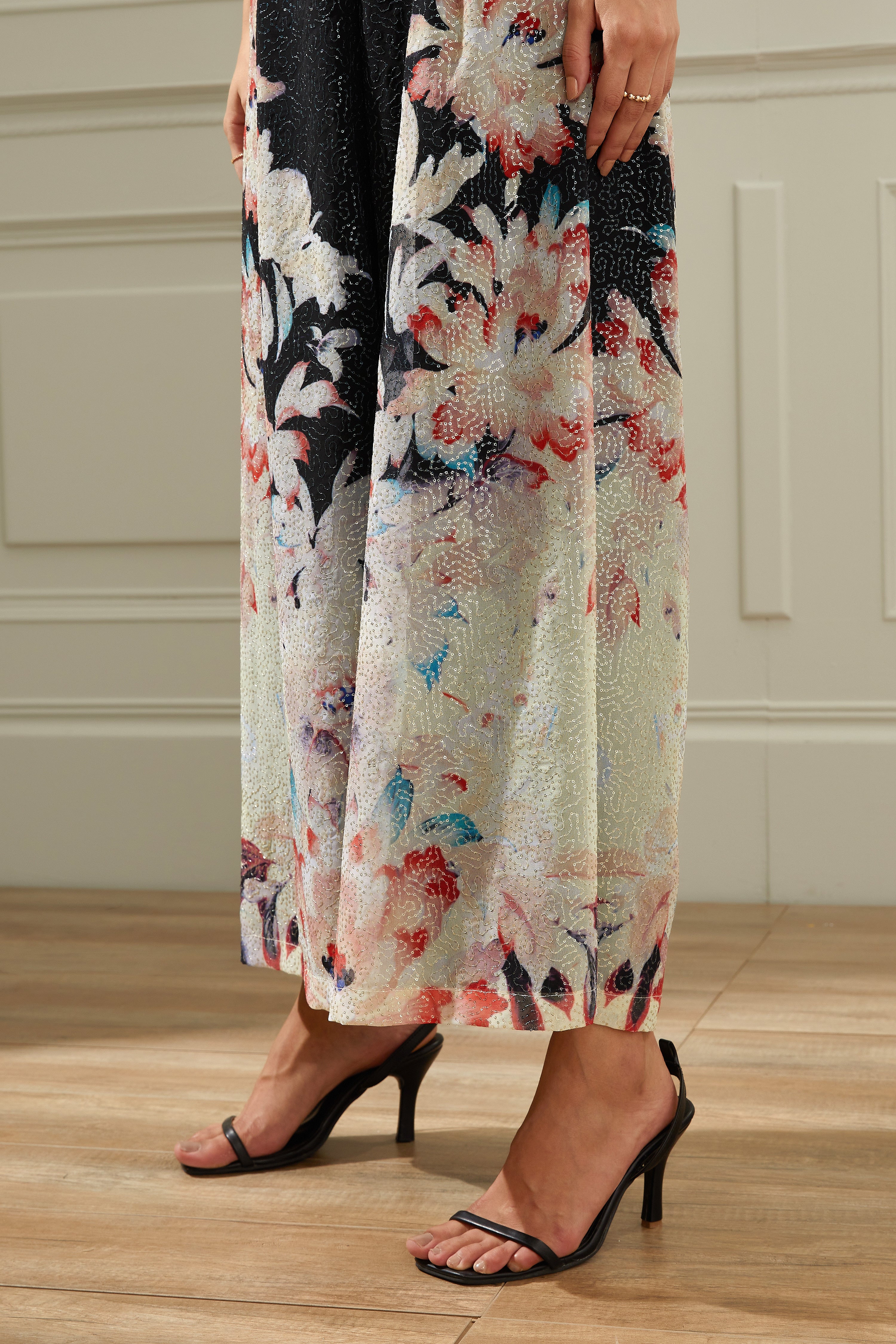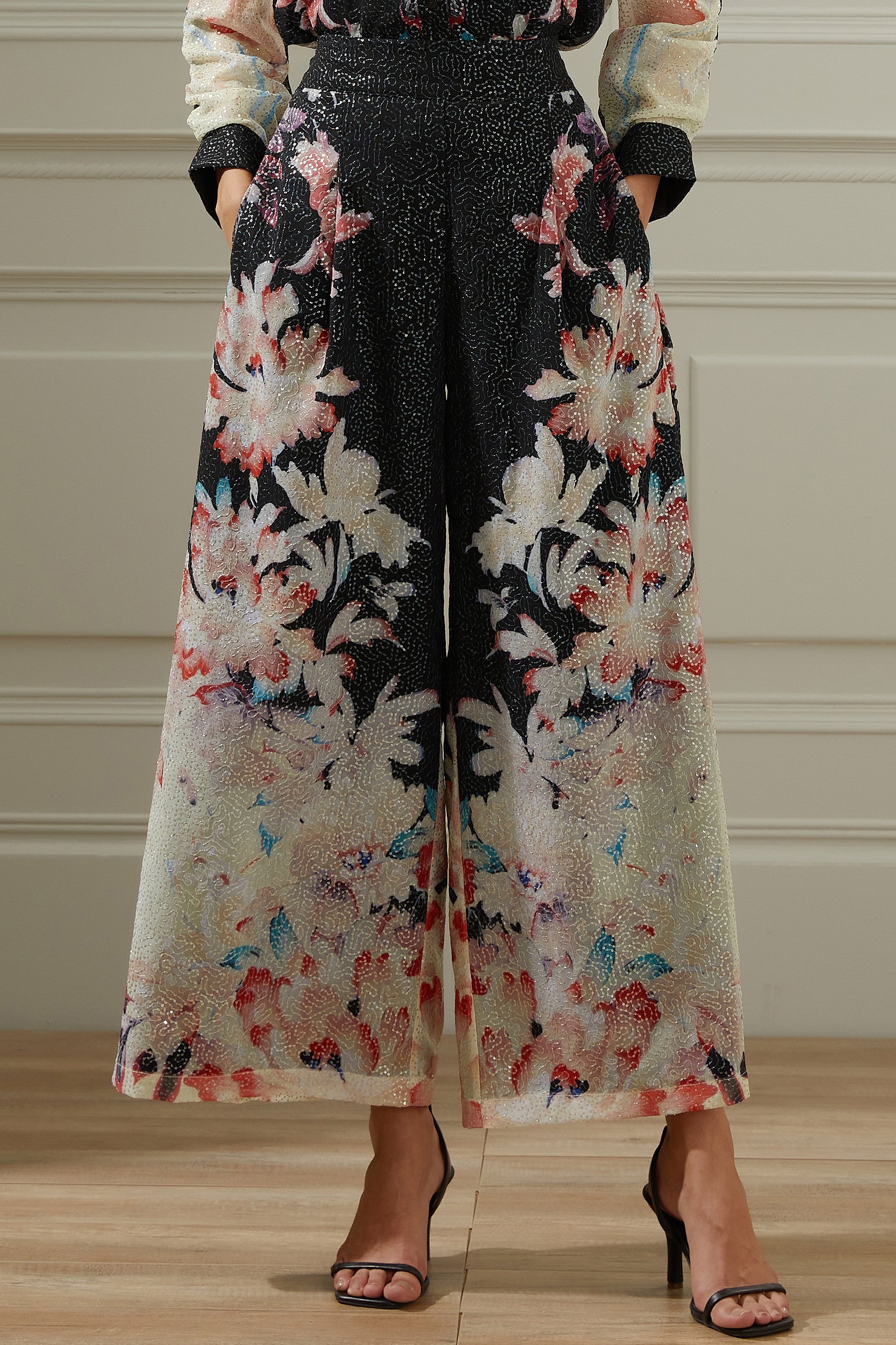 Made in exquisite gold sequins and georgette, this wide-leg pants is elevated with an opulent signature print of Mightnight Floral. Pair it with matching blouse to create a chic co-ordinated look.
