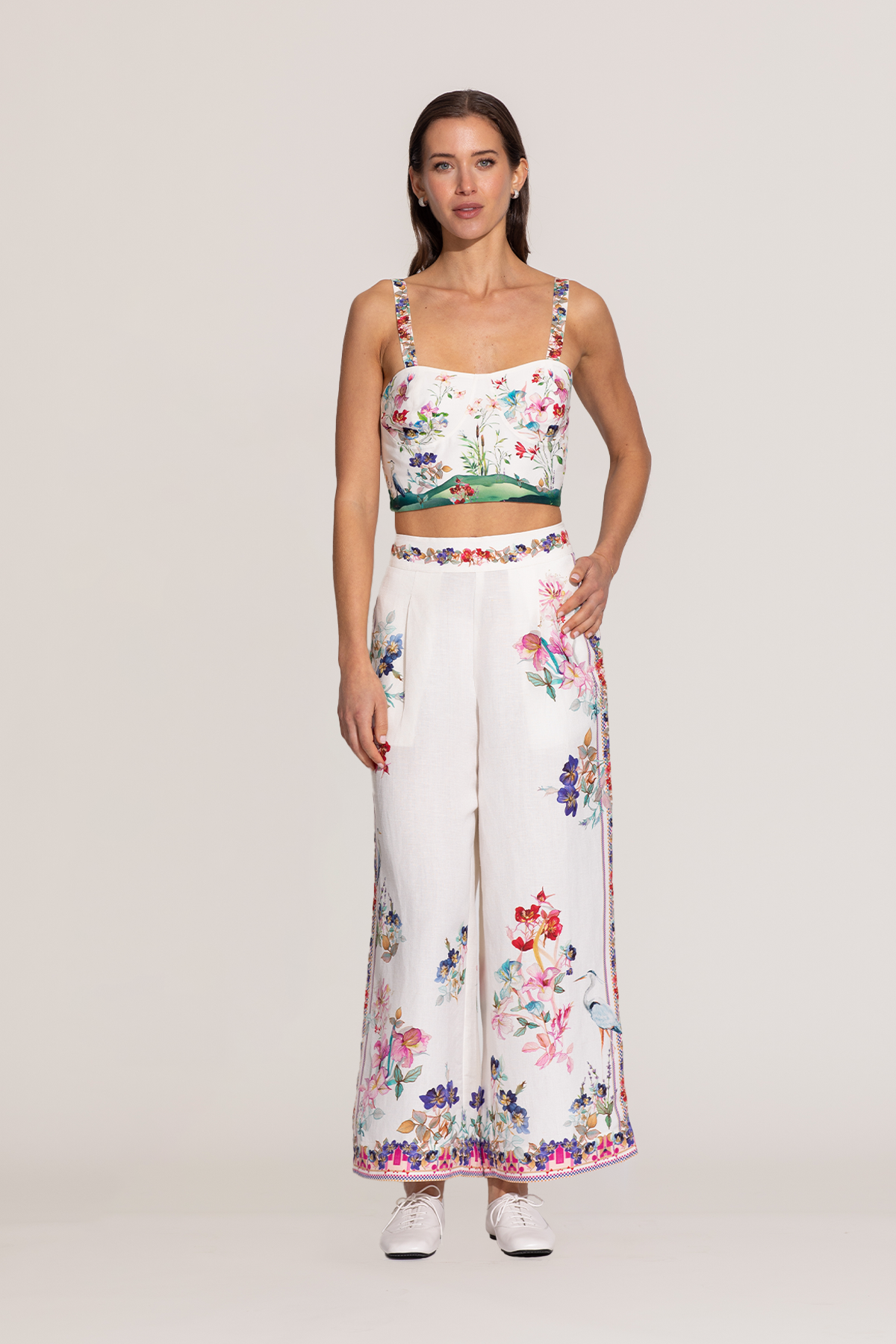Featuring Ranna Gill's Layla Bustier made in breathable cotton, it brings a fresh take to florals with the Ivory Lilacs print blooming across its cropped silhouette. The square neckline and sleeveless straps carry the same floral artwork, creating a cohesive story. Highlighted with a scenic landscape print panel at the hem, this piece pairs perfectly with the Alvia Culottes pant for a coordinated look.