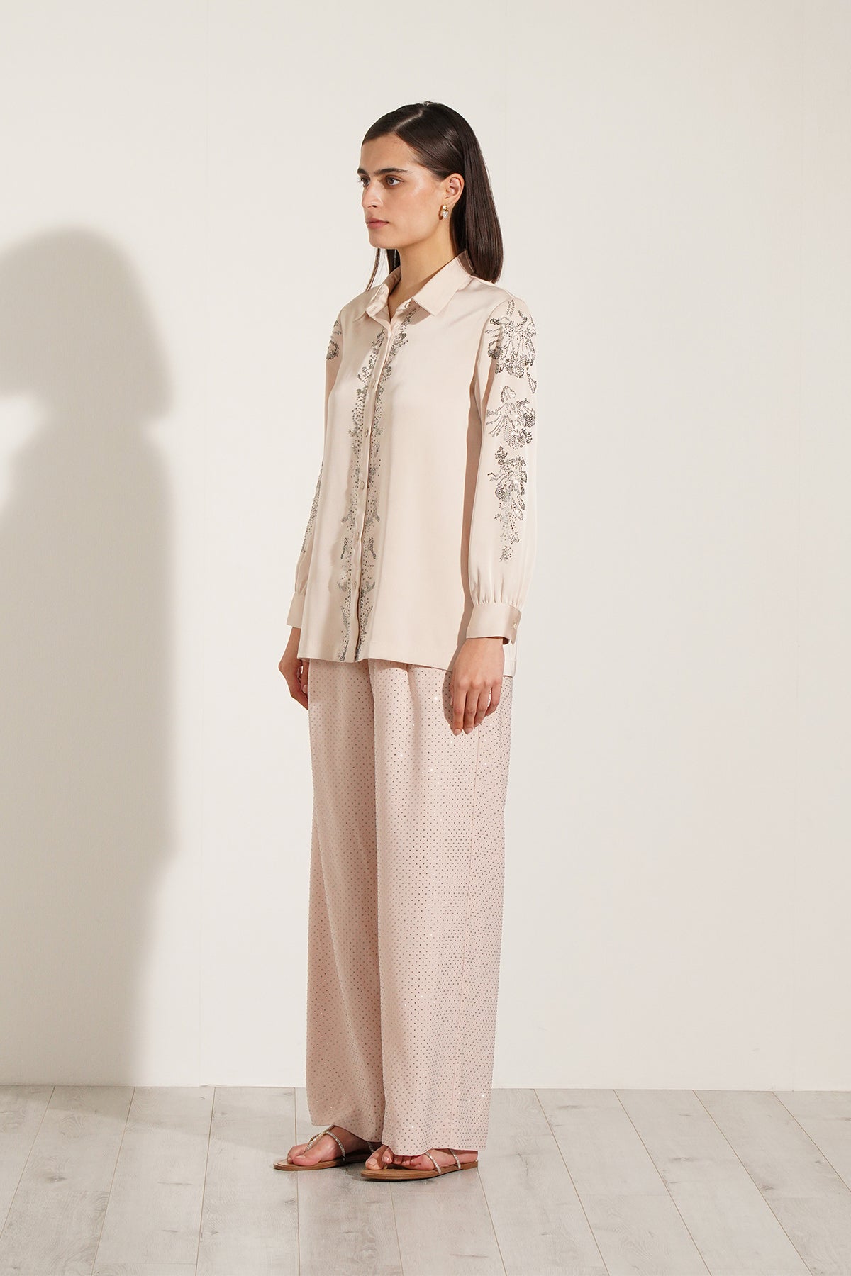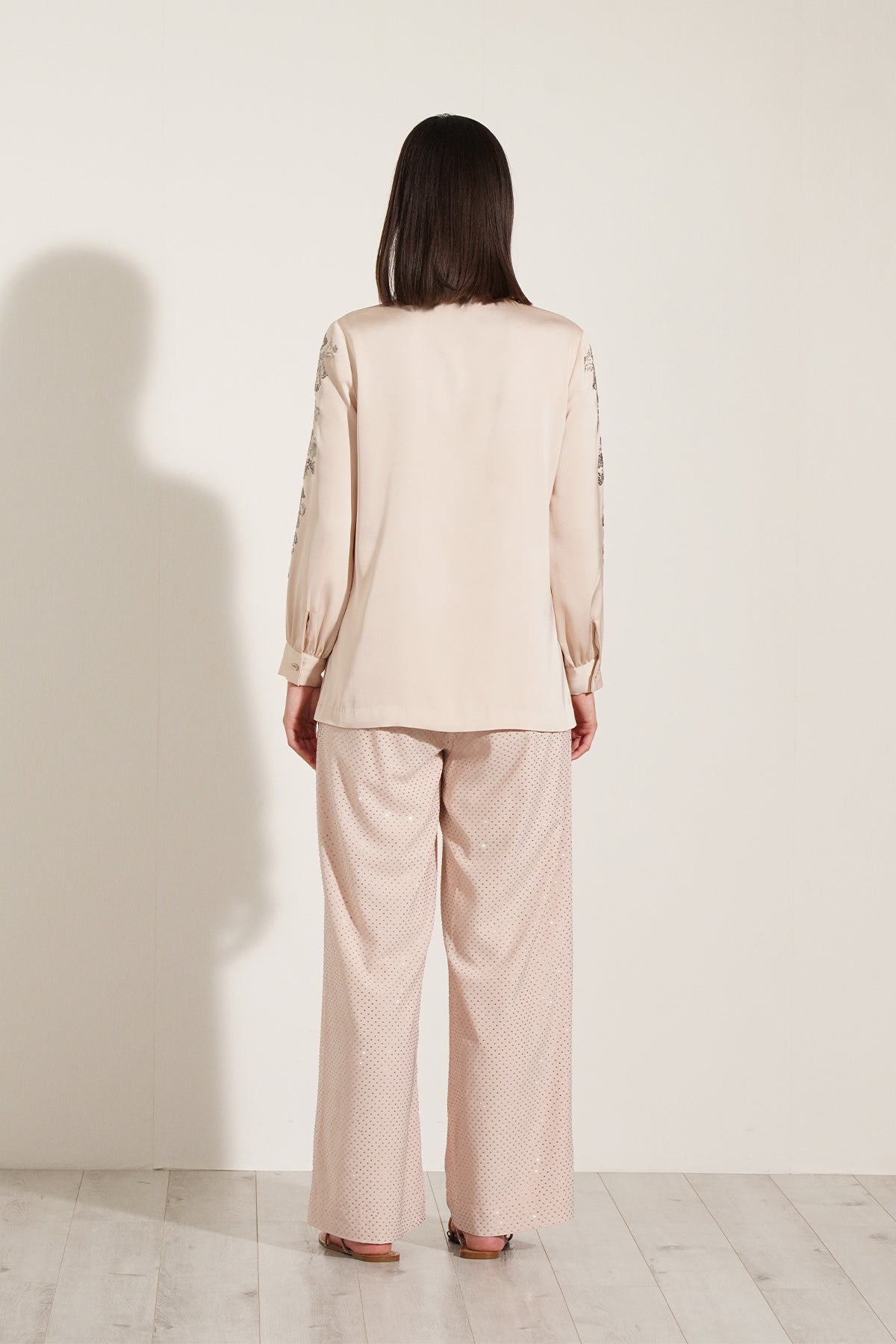Introducing the Lumina Shirt by Ranna Gill, a pinnacle of refined elegance. This shirt, in a versatile neutral color, is designed for both formal occasions and special events. Crafted from premium fabric, it offers a flawless fit and exceptional comfort. The standout feature is the exquisite stone detailing on the placket and on the sleeves, adding a touch of luxury and sparkle. Whether for a high-profile meeting or an elegant evening, the Lumina Shirt ensures you make a memorable impression with its classic style and opulent details.