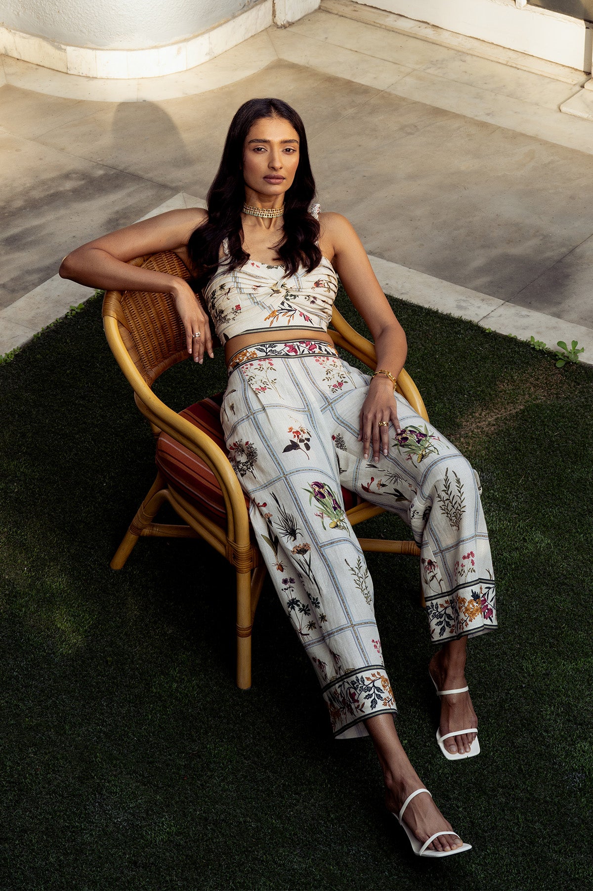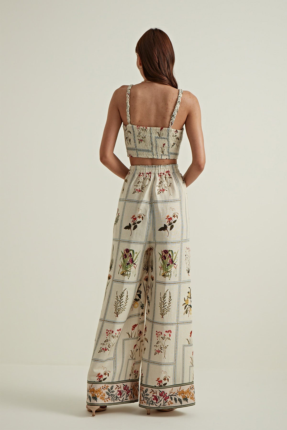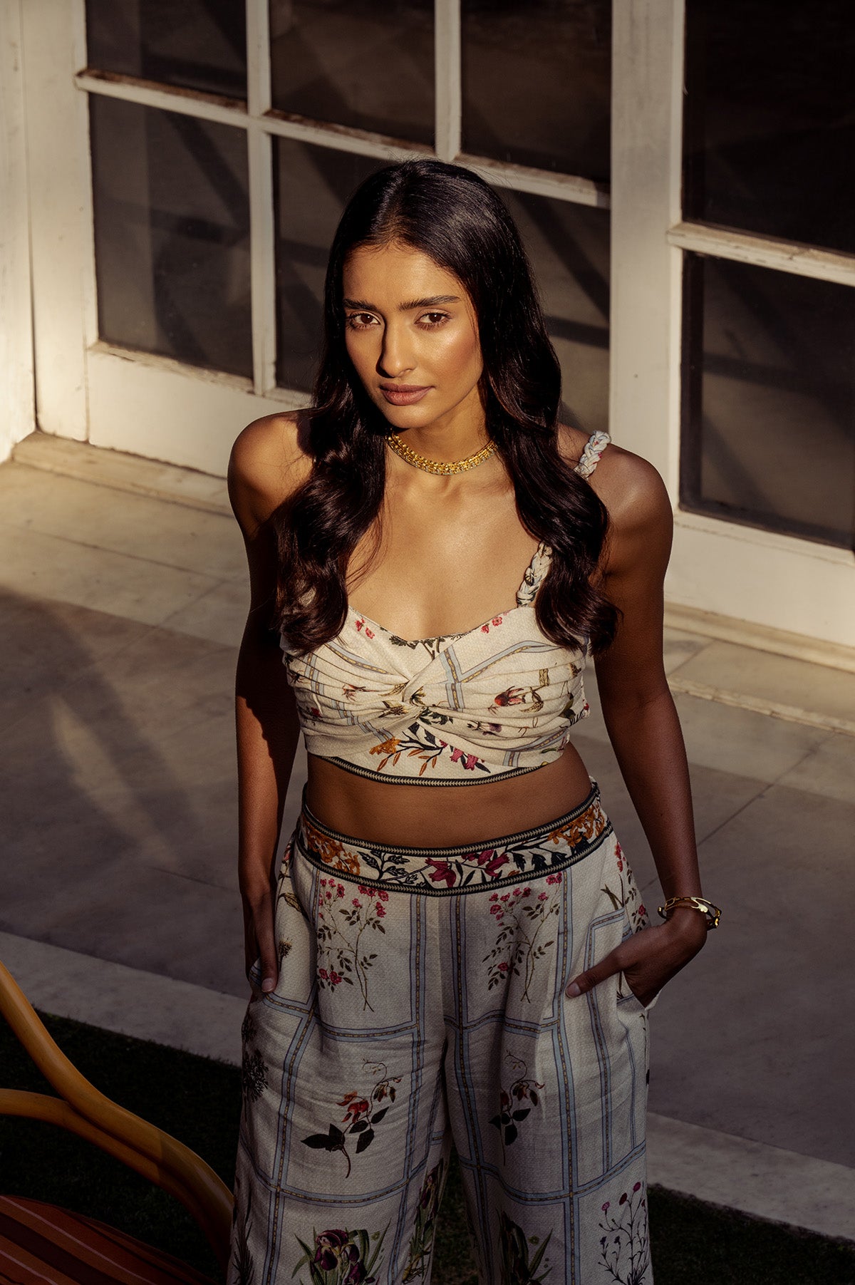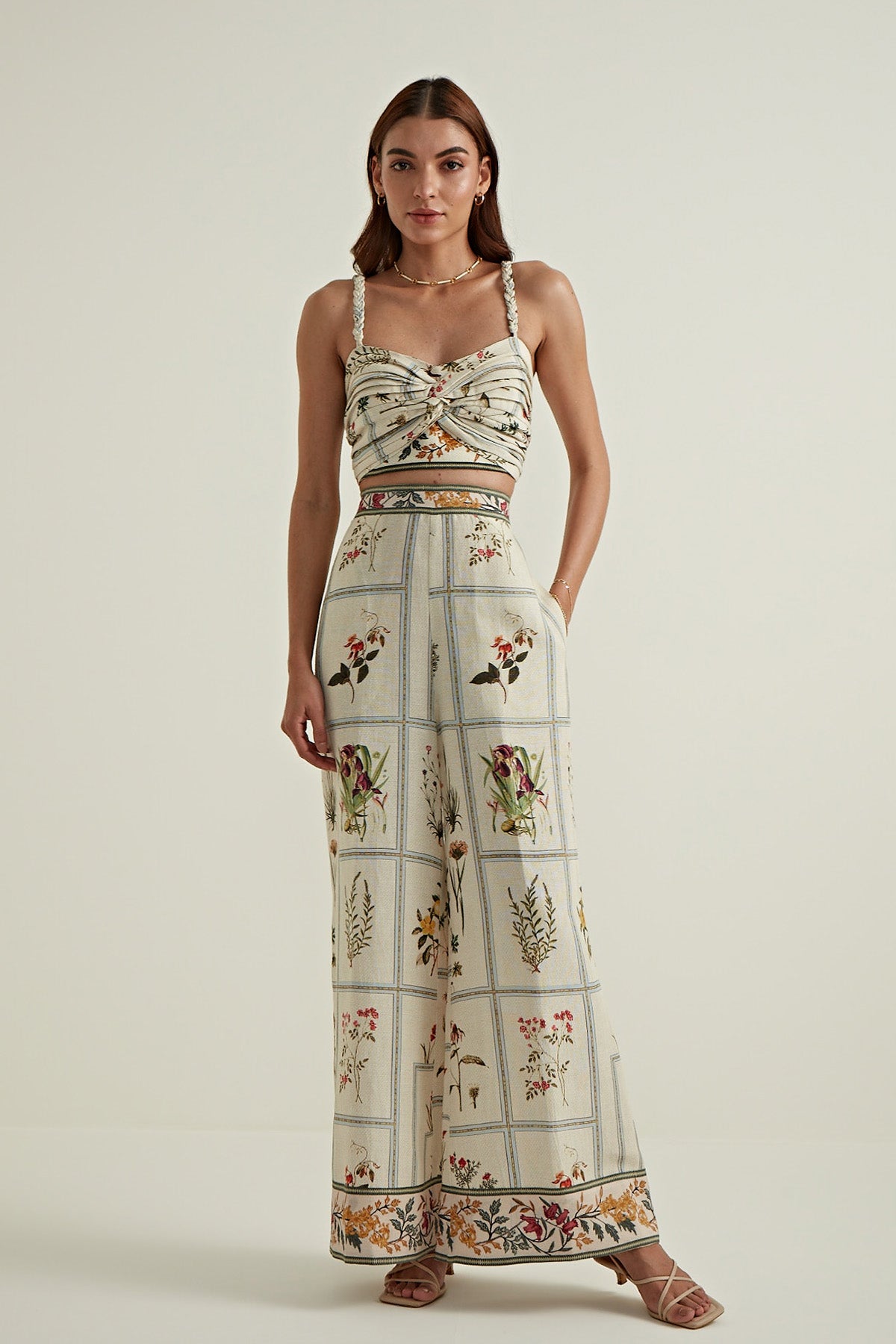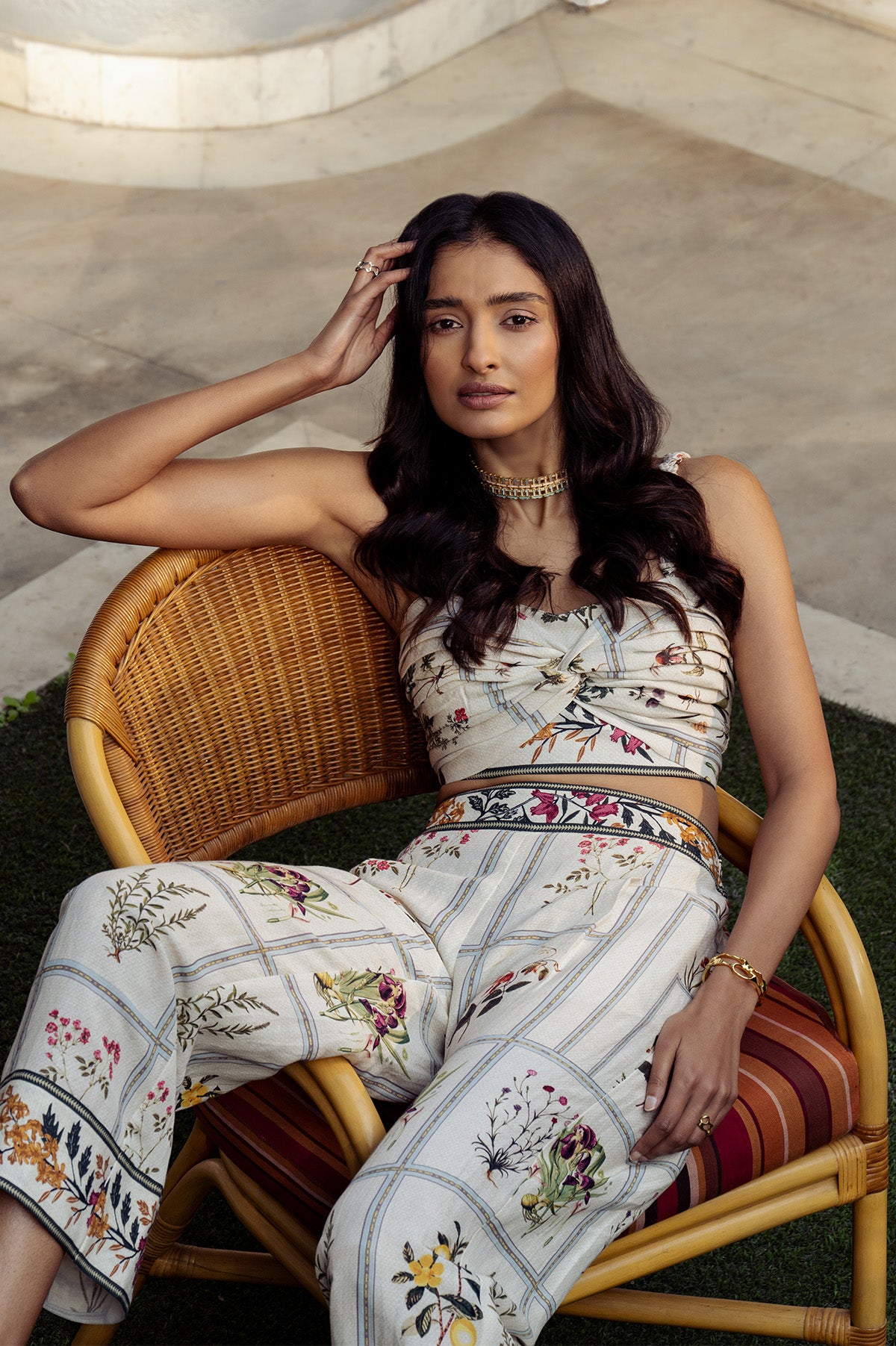 Elevate your vacation style with the Nori Bustier, an exciting addition to your wardrobe. Crafted from a luxurious Linen-Viscose blend, this bustier in a captivating Beige color exudes sophistication. The strappy neckline adds a touch of allure, while the mesmerizing Tile Bloom print brings a playful and vibrant energy. Pair it with our wide leg pants for a chic and fashion-forward vacation look that will turn heads.
