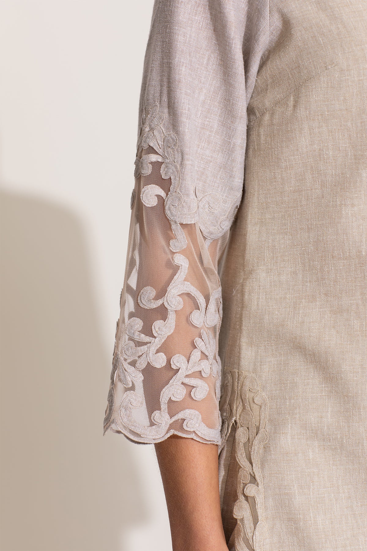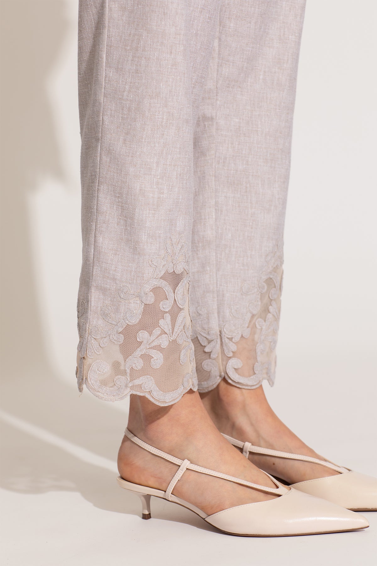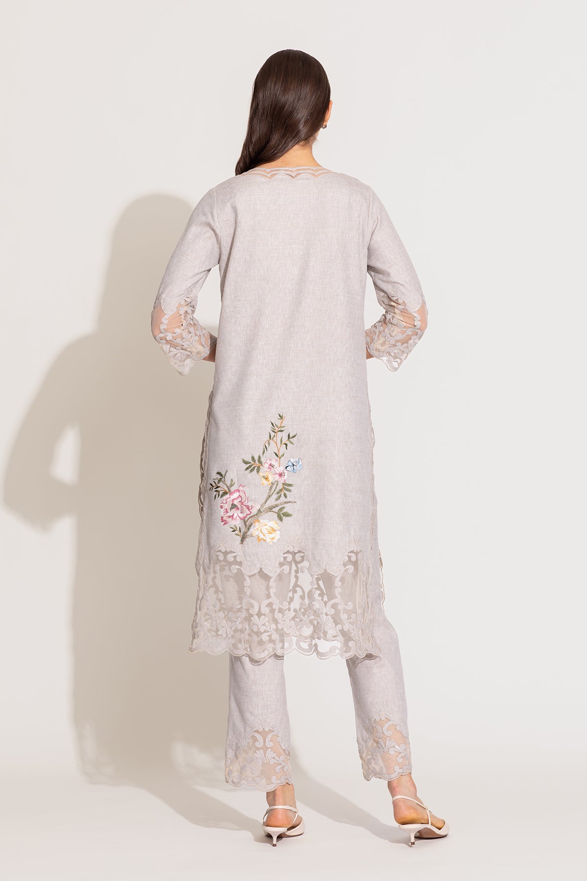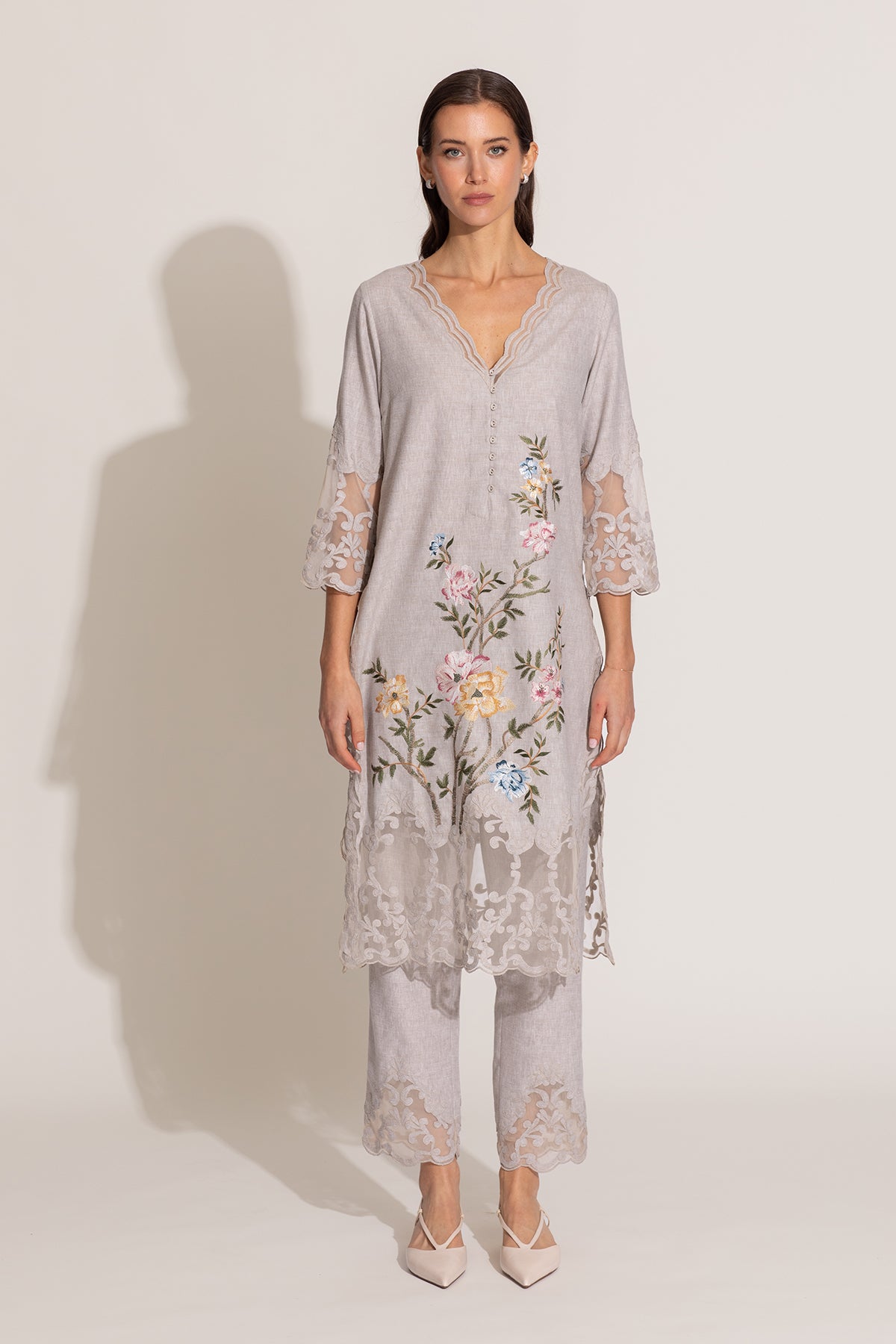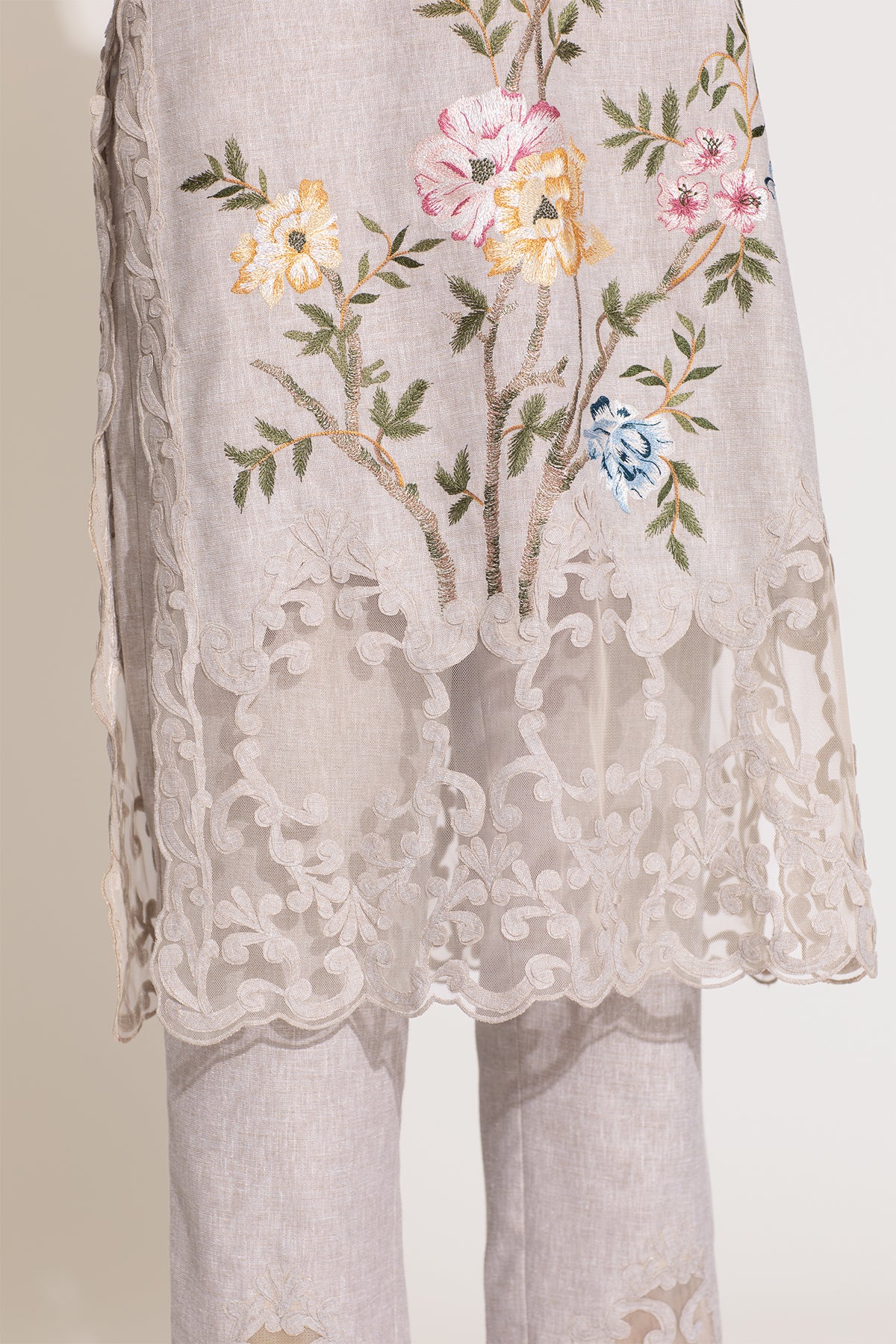 Step into chic luxury with Oman Tunic Set by Ranna Gill, designed in a beige shade. This set features delicate floral embroidery in soft pinks, blues, and gold, blooming across the tunic with threadwork. The scalloped V-neckline and intricate lace edging add depth, while sheer sleeves with embroidered accents bring a touch of glam. Paired with matching embroidered pants and a tulle dupatta adorned with floral motifs, this set is designed to make a statement. A celebration of craftsmanship, this new-season piece is an exquisite addition to your closet.