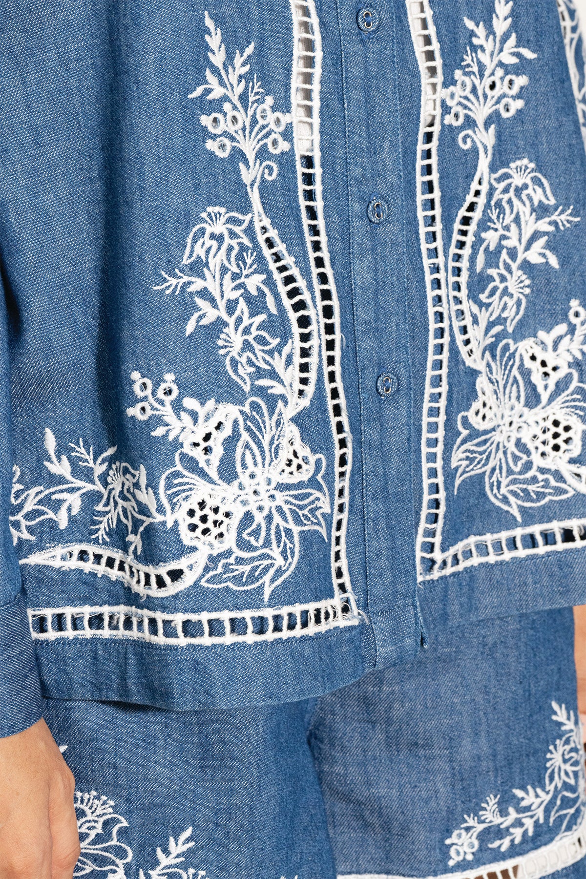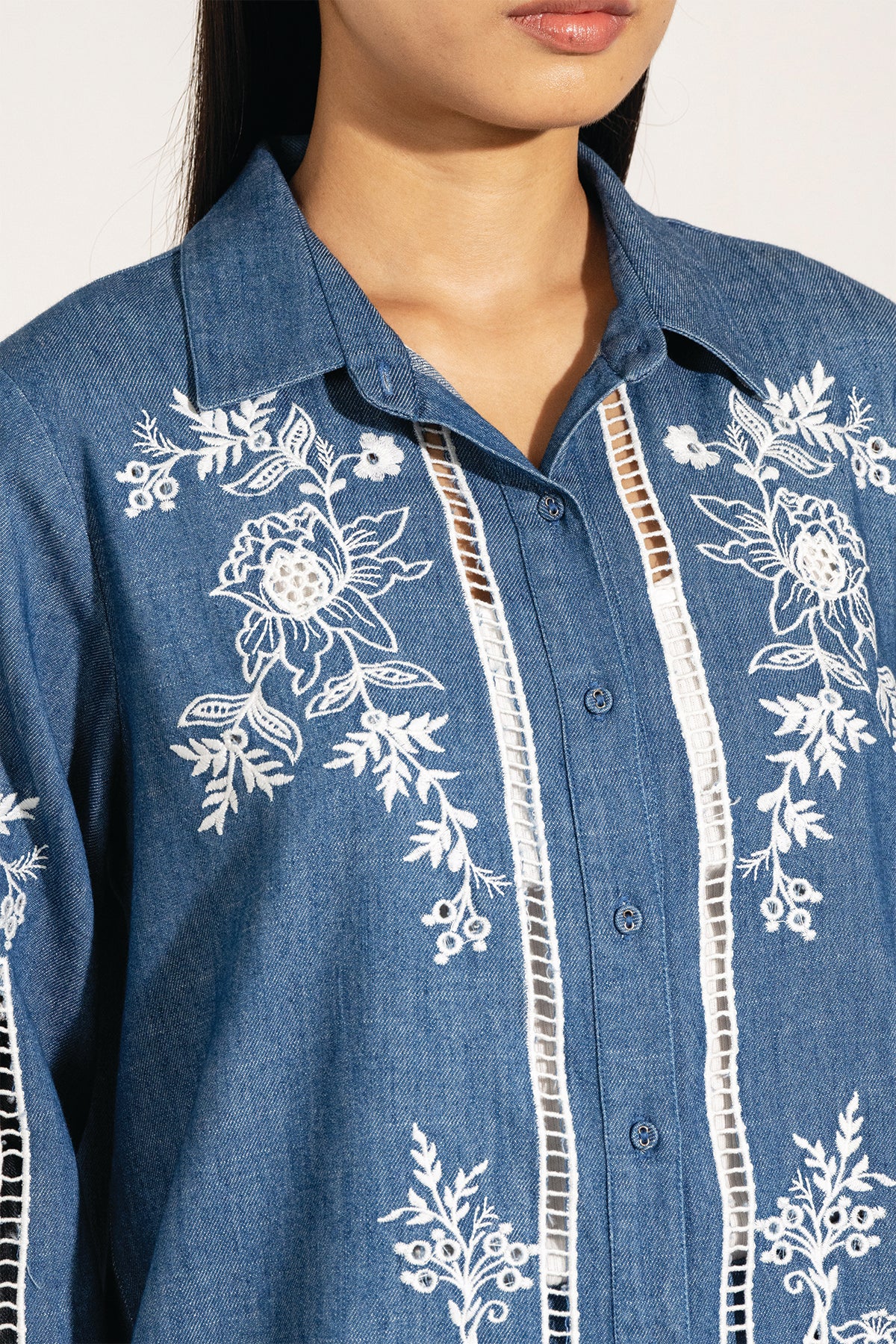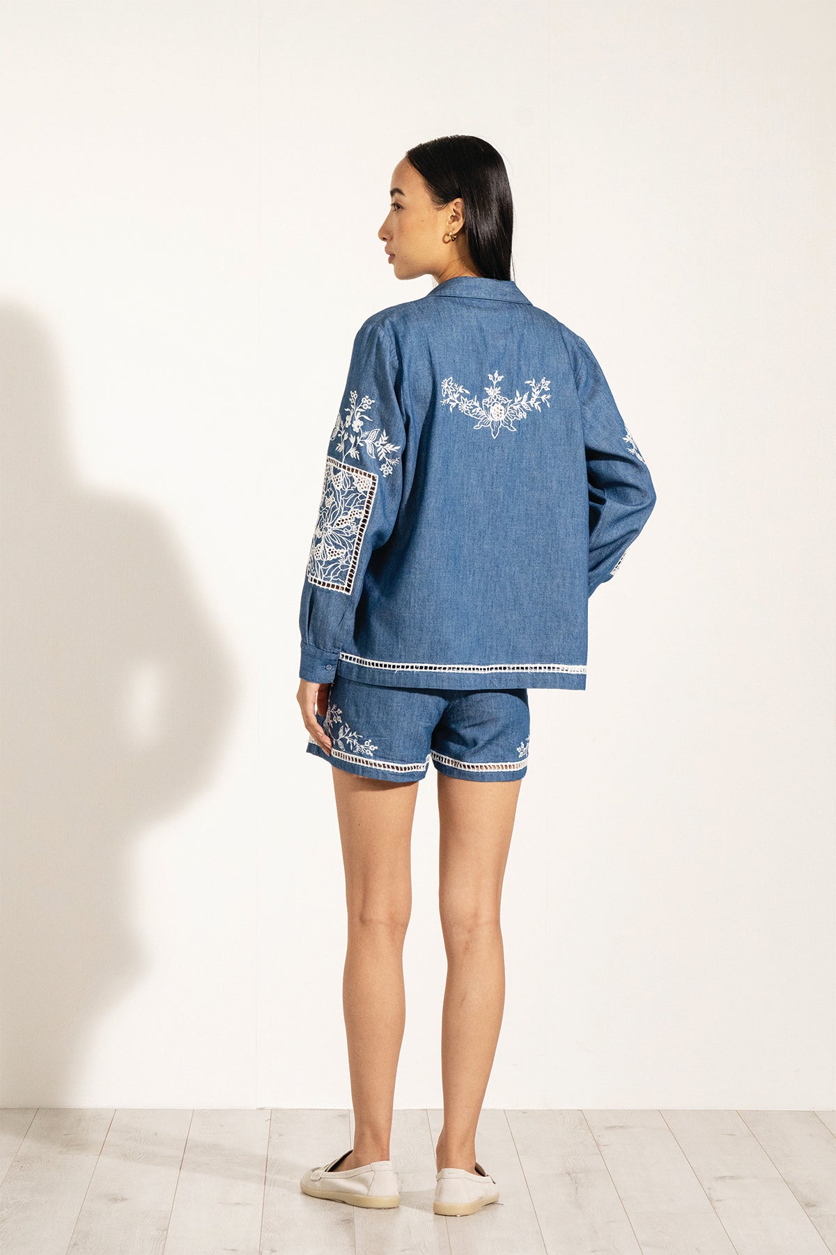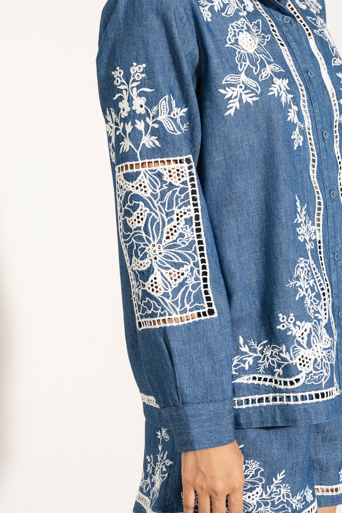 Elevate your wardrobe with the timeless charm of Ranna Gill's Vira Buttondown Shirt. Crafted in soft denim in a serene ocean blue, this shirt is adorned with intricate embroidered eyelet detailing that brings a delicate floral touch to the fabric. Inspired by nature’s beauty, the design seamlessly blends structure with elegance, making it perfect for both casual and refined looks. Pair it with the Ela Shorts for a coordinated look.